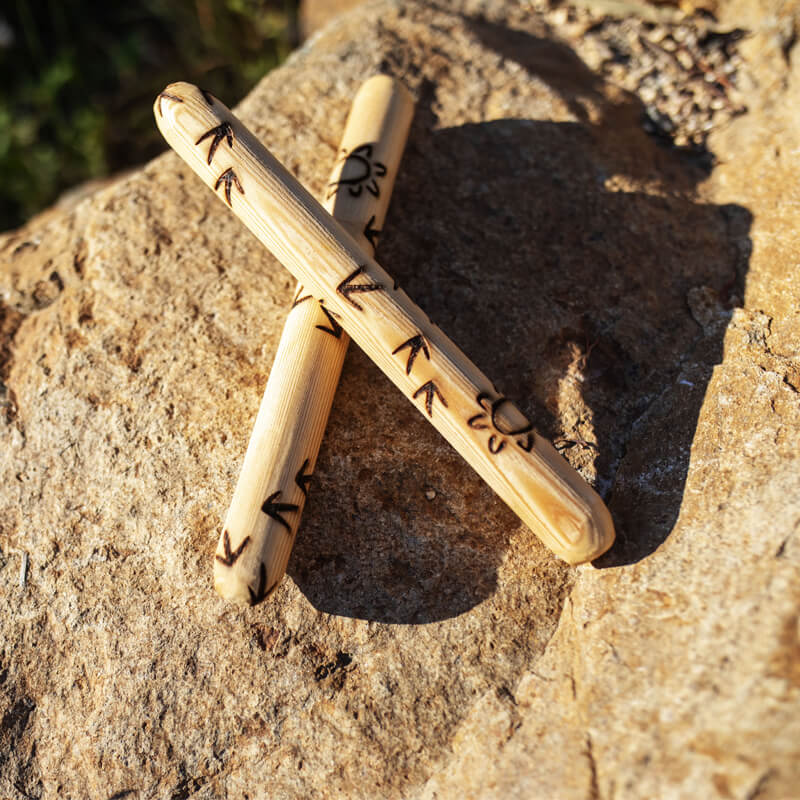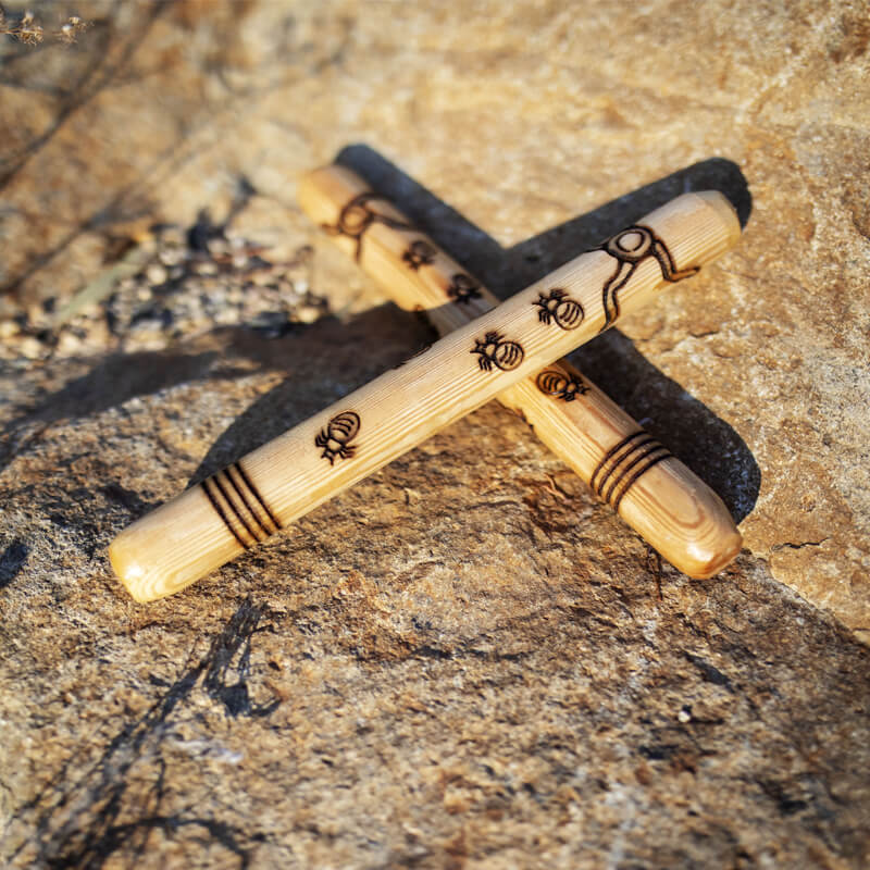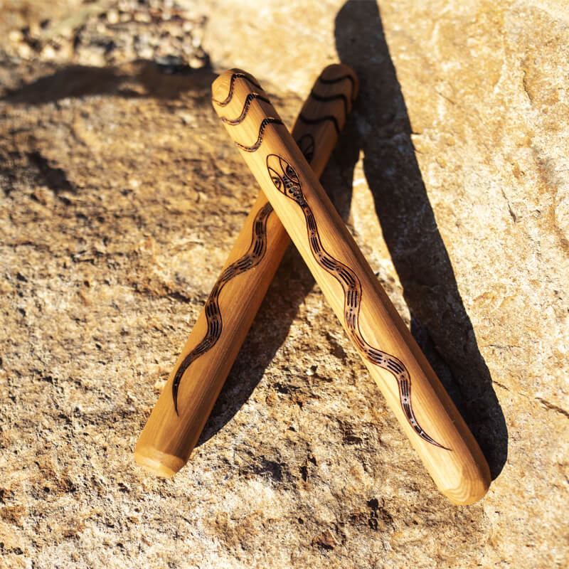 Featuring a detailed design of a hunting camp following Emu tracks, this traditional hardwood clapstick celebrates connection to Country through sound and story.