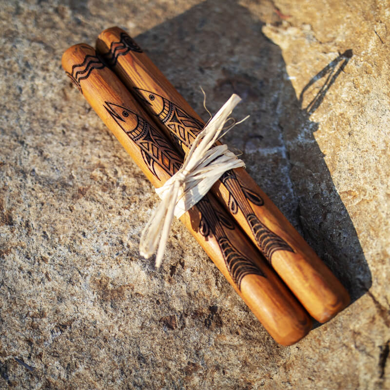 Featuring a Guya (Fish) design, this traditional hardwood clapstick symbolises water, life, and sustenance from Country.