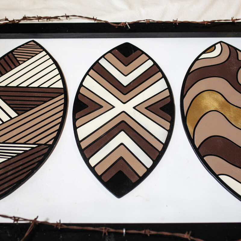 Each piece is inspired by Country and culture and is deeply connected to Wiradjuri heritage. The designs reflect traditional stories, patterns, and symbols such as hunting camps, animal tracks, and scar trees, carrying the spirit of the land and its people.